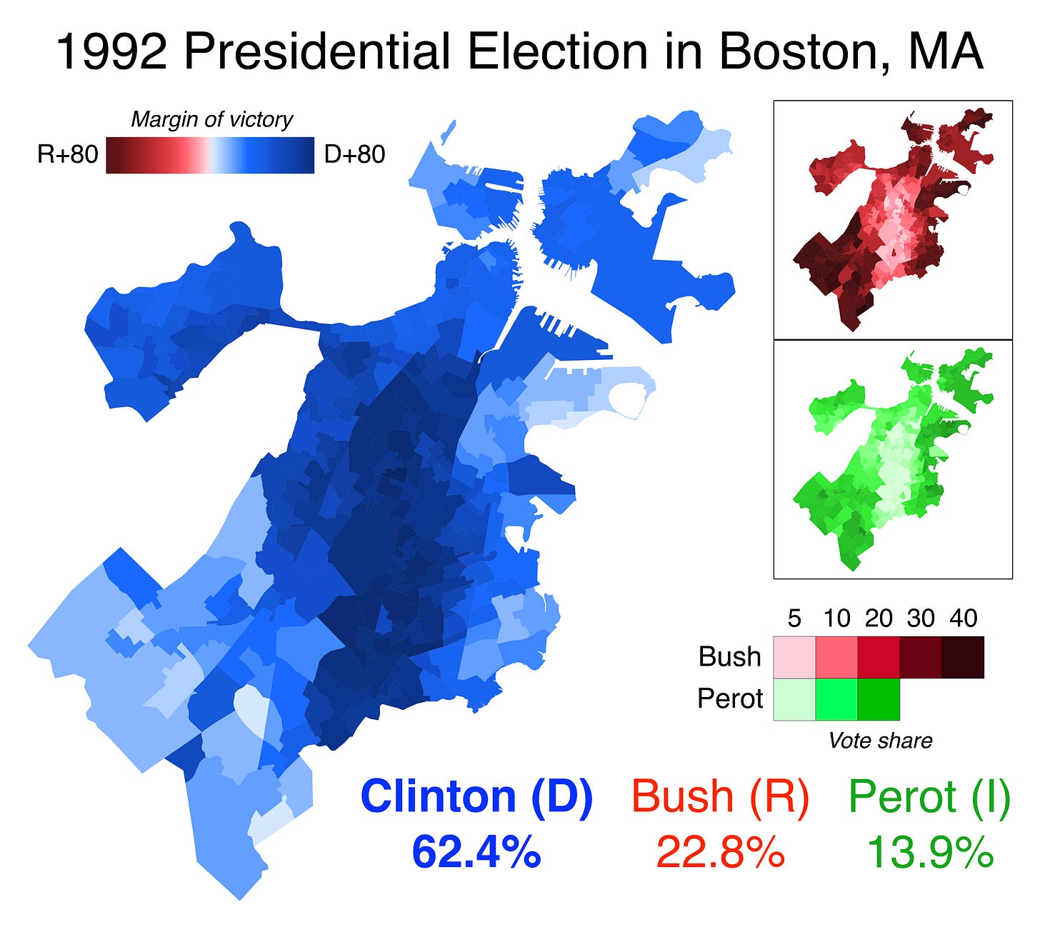 From a trends perspective, this election wasn’t particularly interesting. Unlike other parts of the country, Ross Perot lacked a distinctive base in Boston — he did 15-20 points worse than Bush almost everywhere. But I enjoyed the layout I made for this one!