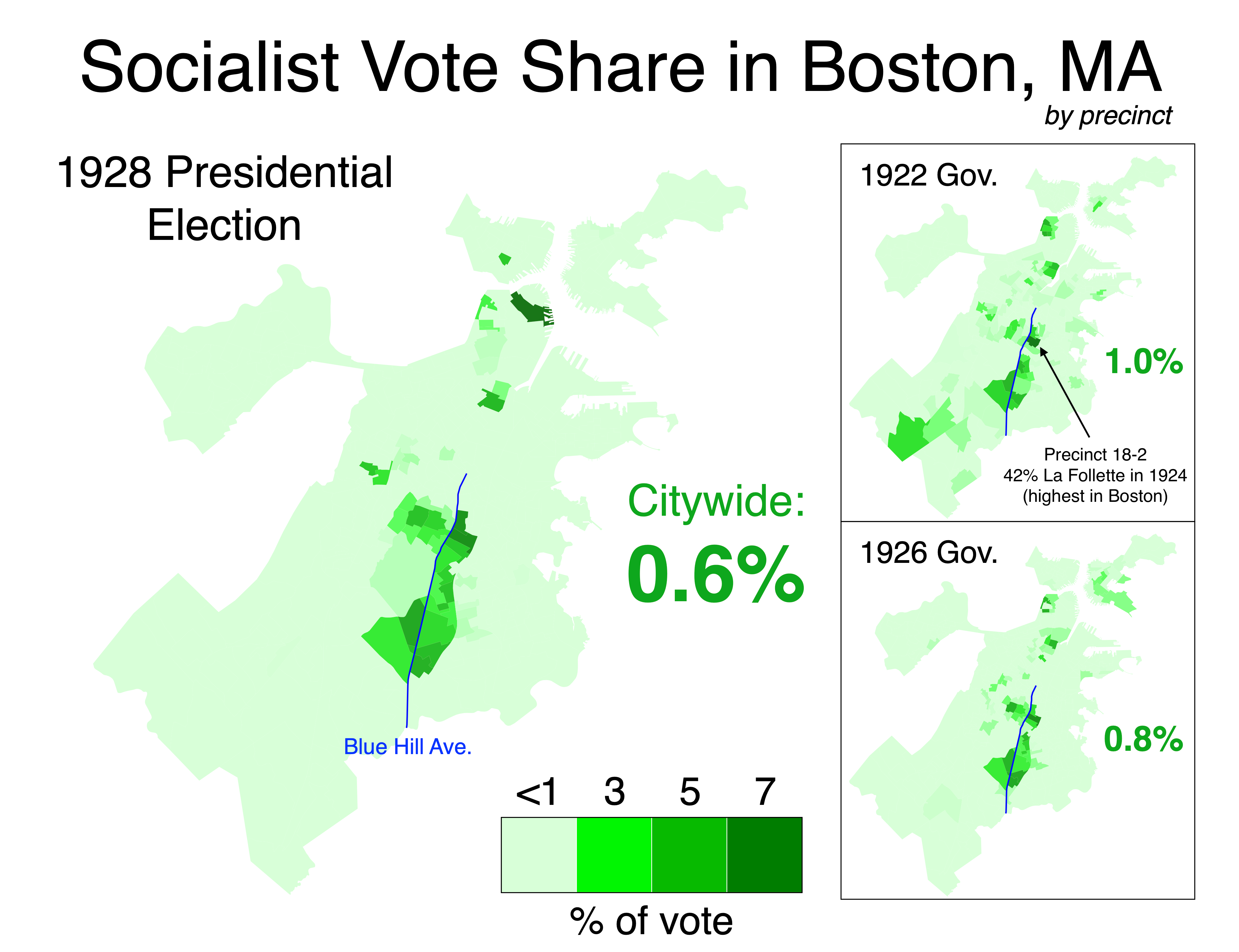 In the 1920s, socialist third-party candidates had a distinct base in Boston: precincts along Blue Hill Avenue, where the city's Jewish community had coalesced. Socialists often combined for as much as 5% of the vote in these areas — far stronger than their citywide performance. Jewish enclaves in New York City were also sympathetic to socialists during this time period.