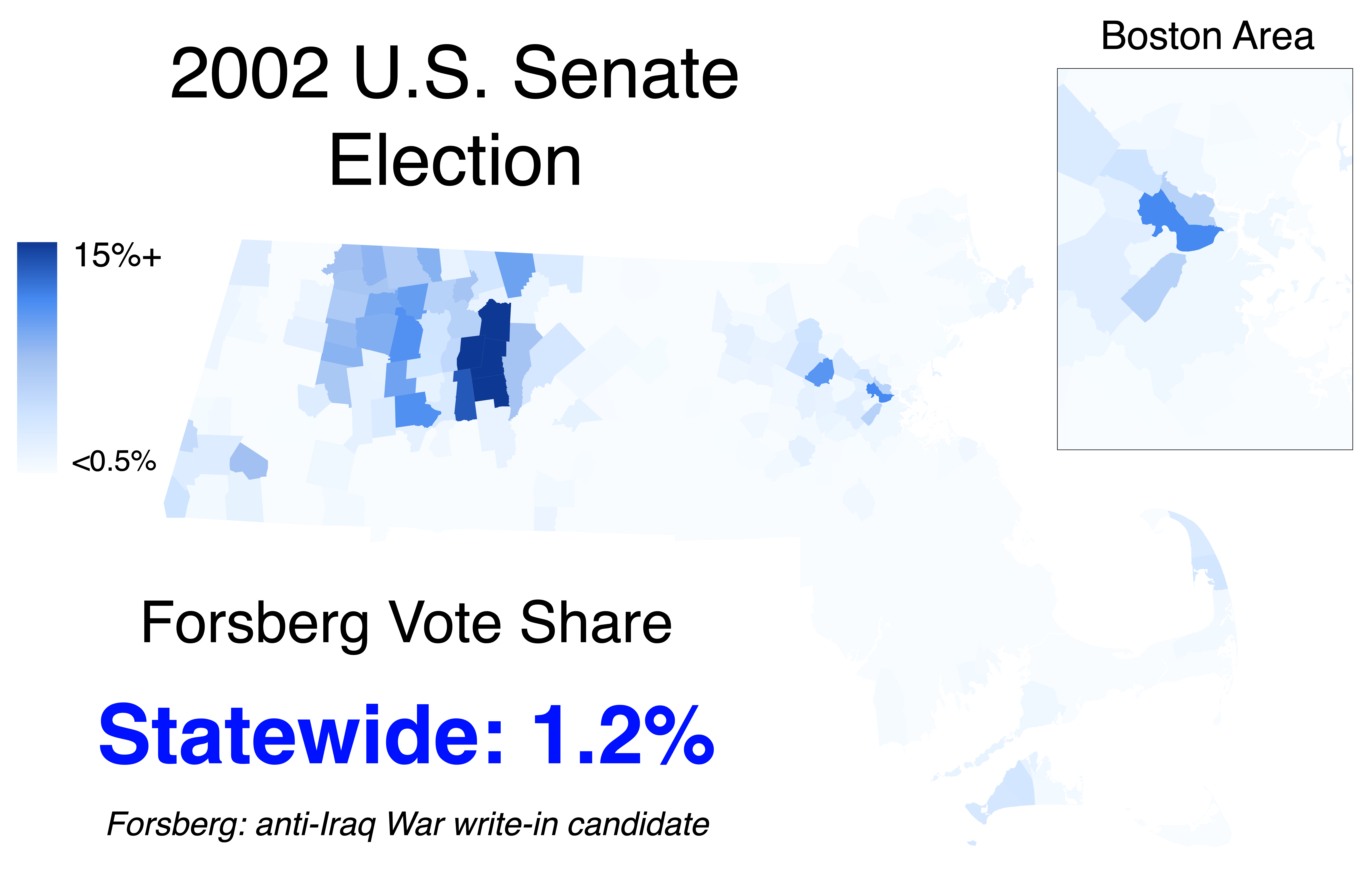 In 2002, Democratic Sen. John Kerry had no Republican opponent. However, the single-issue write-in campaign of Randall Forsberg, an anti-Iraq War activist, gained serious traction in the hill towns of the northern Pioneer Valley. This is the map I reference first when explaining to others that region’s historic countercultural lean (it also heavily supported Jesse Jackson in the 1980 Democratic presidential primary, a major outlier among majority-white places).