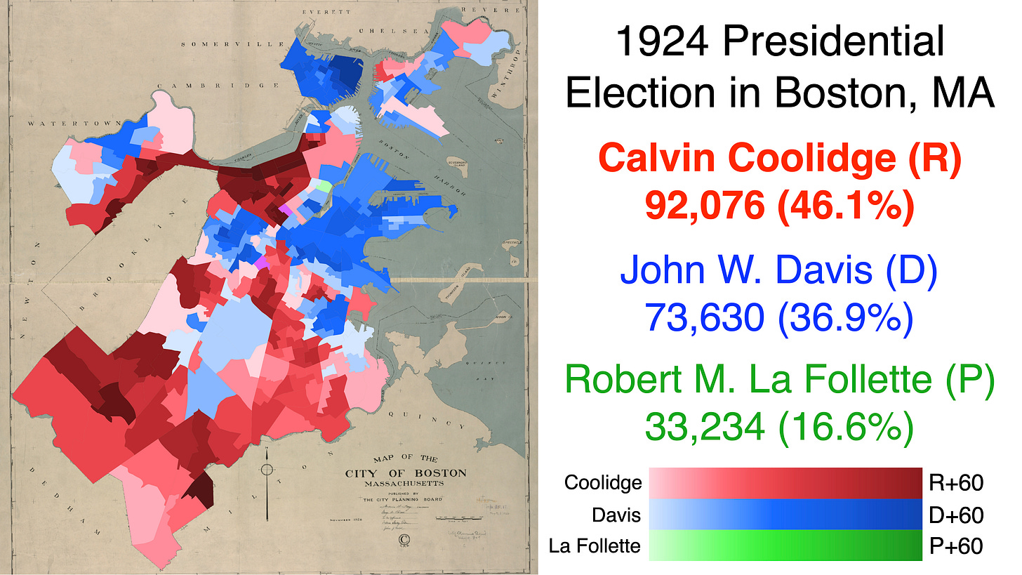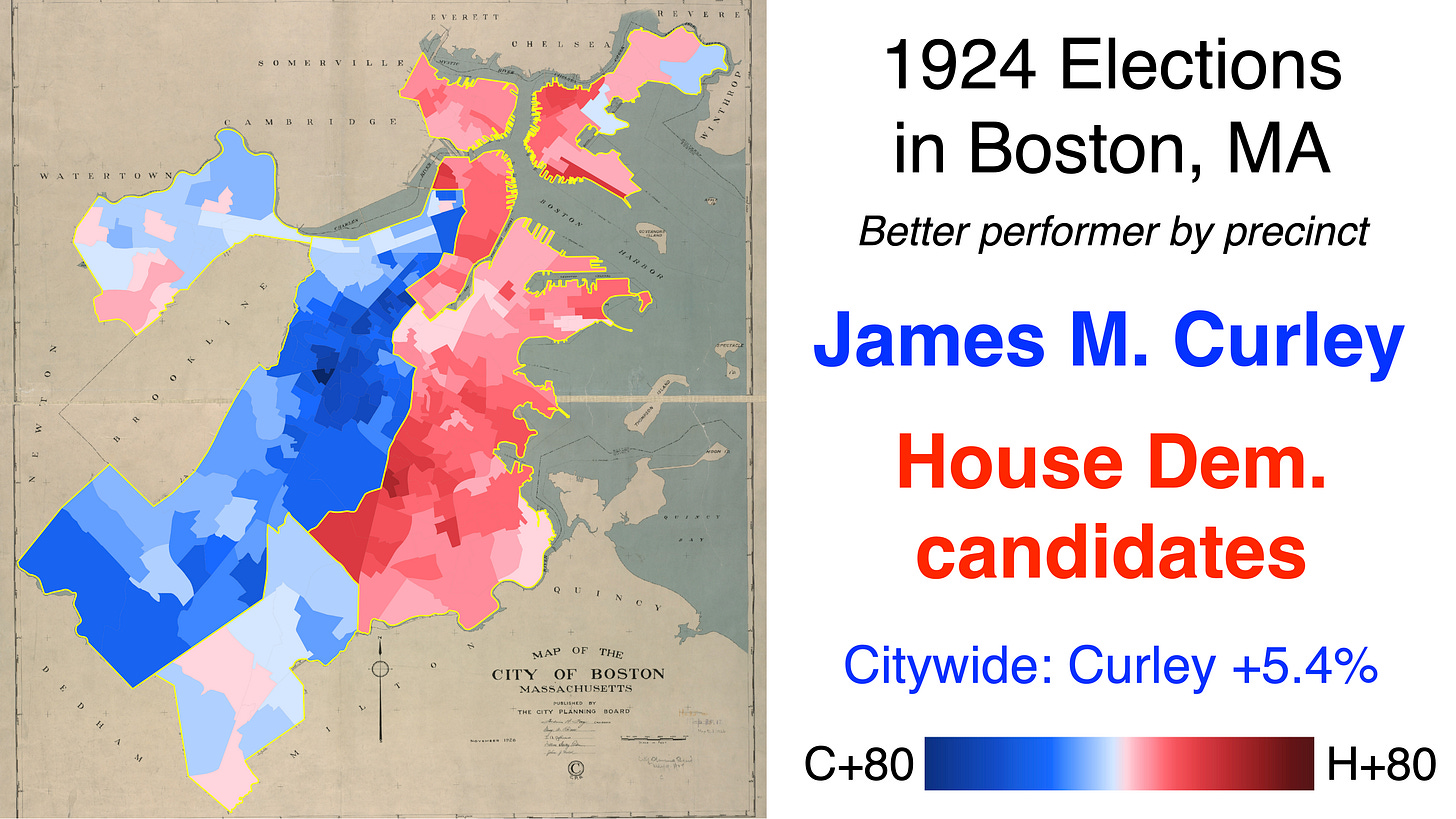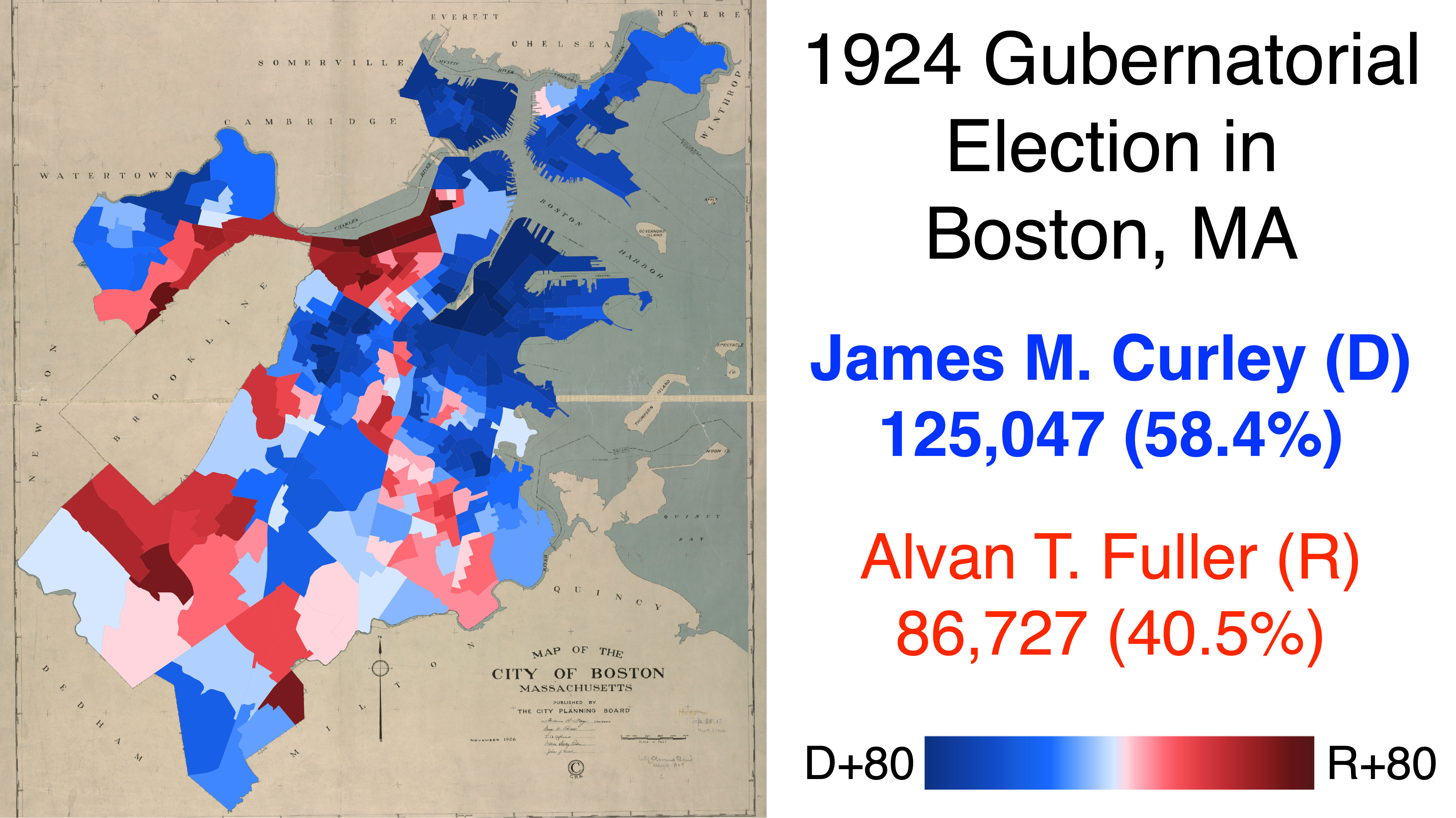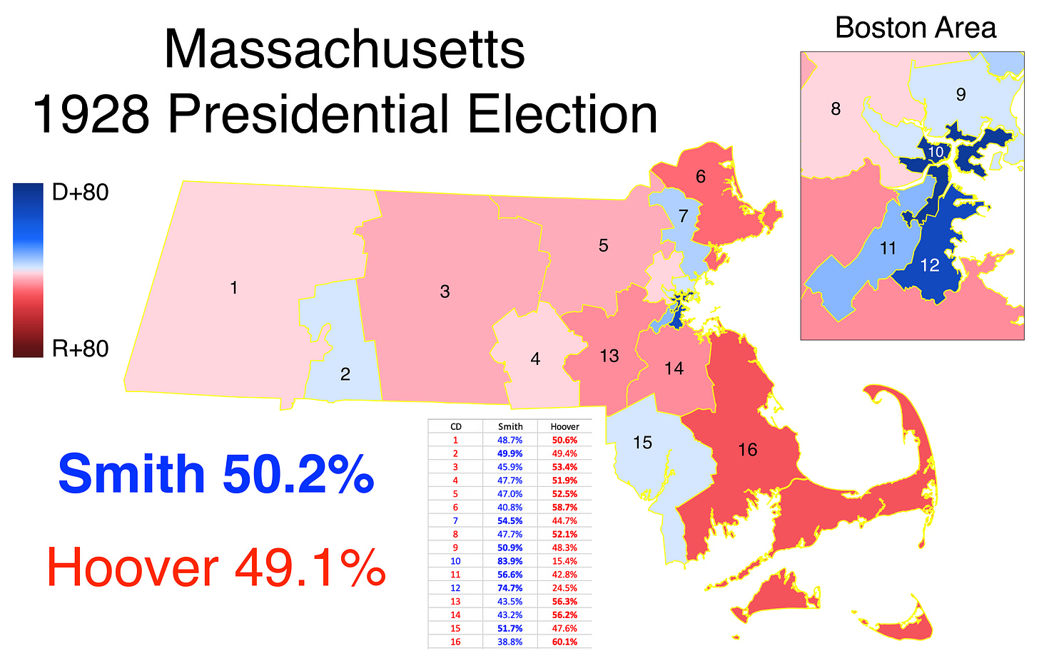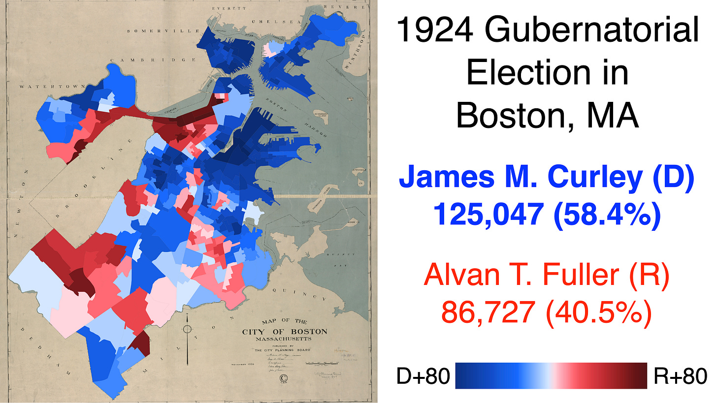 By this time, Boston had become a reliably Democratic city. Its immigrant communities — first Irish, now Italians and Jews — were still growing quickly, while native-born Yankees had become a minority. In the gubernatorial race, James Michael Curley won Boston by 18 points despite losing comfortably statewide: