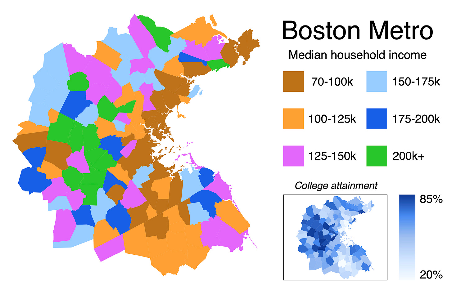 Another one I’m including because I liked designing the layout, this map buckets towns in the inner Boston metro by median household income and includes college attainment as a reference. Note that MetroWest is both affluent and high-college, whereas towns east of Route 3 have more middling college attainment despite still being quite wealthy. Also note that no town in the area has a median income below $70,000 — this is a wealthy metro area by any standard.