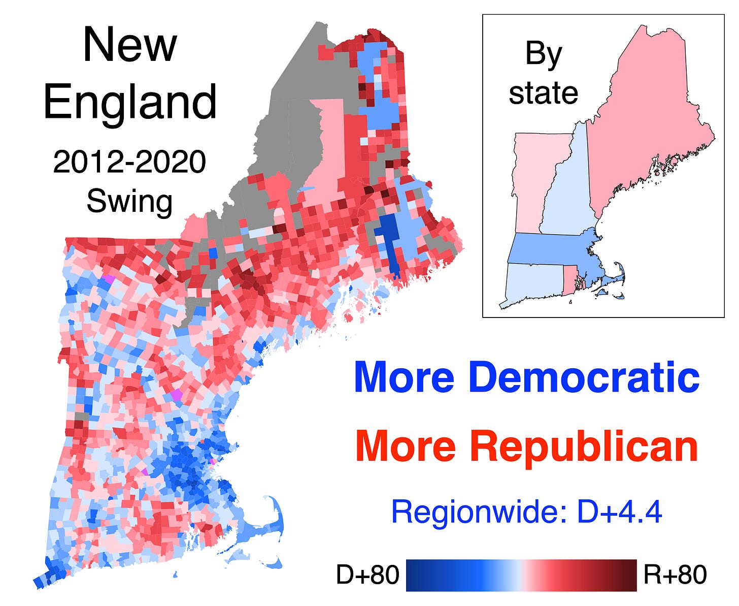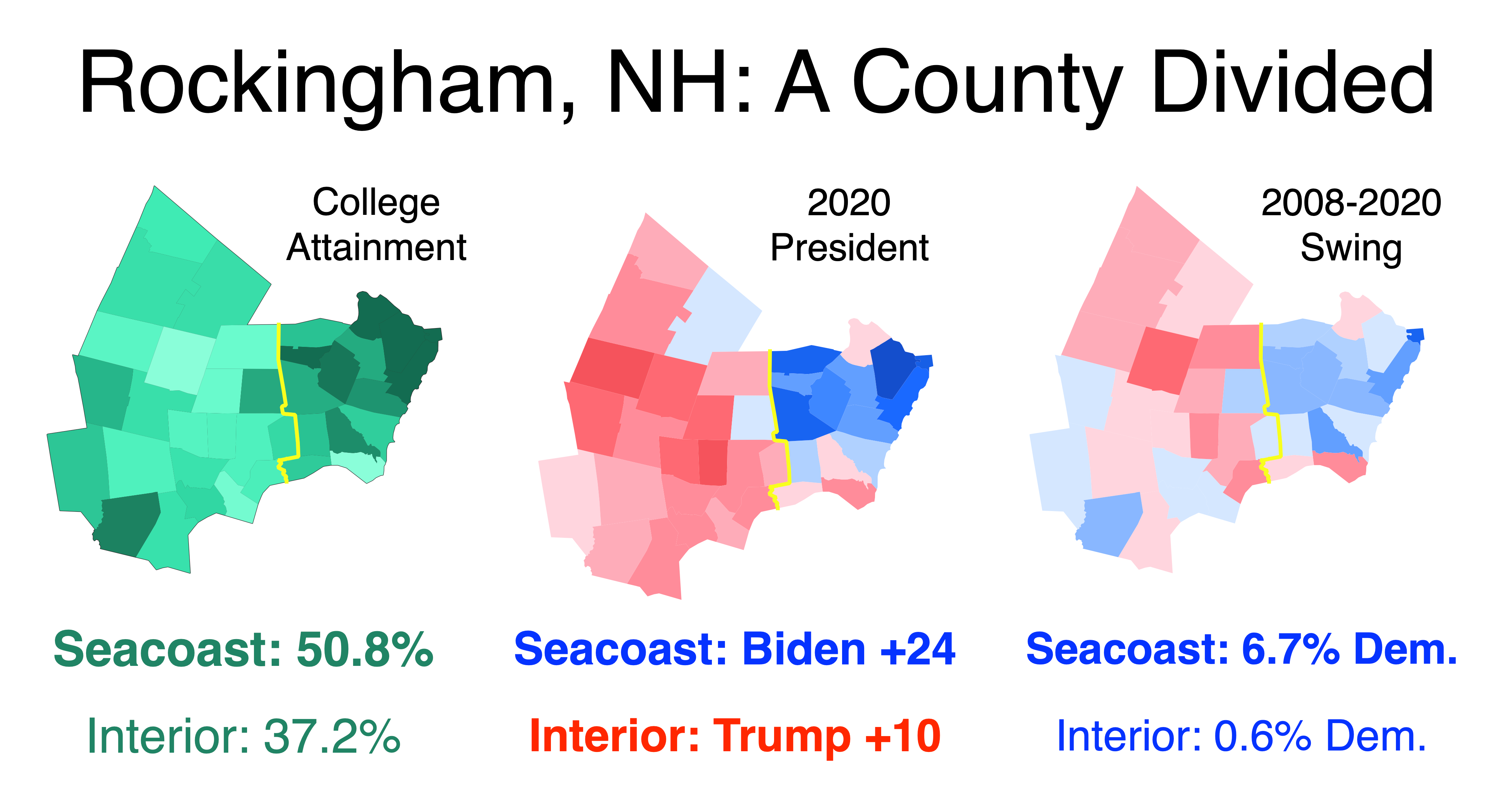 National analysts often point to counties to try to explain voting trends, but this approach usually proves inadequate in New England, which is organized at the town level even if county boundaries still exist. A prime example of this is Rockingham County, New Hampshire, which I’ve seen described as “moderate” — in reality, it’s sharply split between two cultural regions: the liberal, upscale Seacoast and the conservative interior. The two portions diverged by 34 points in 2020, and the gap is only growing.