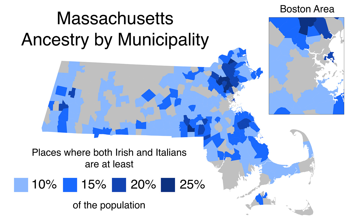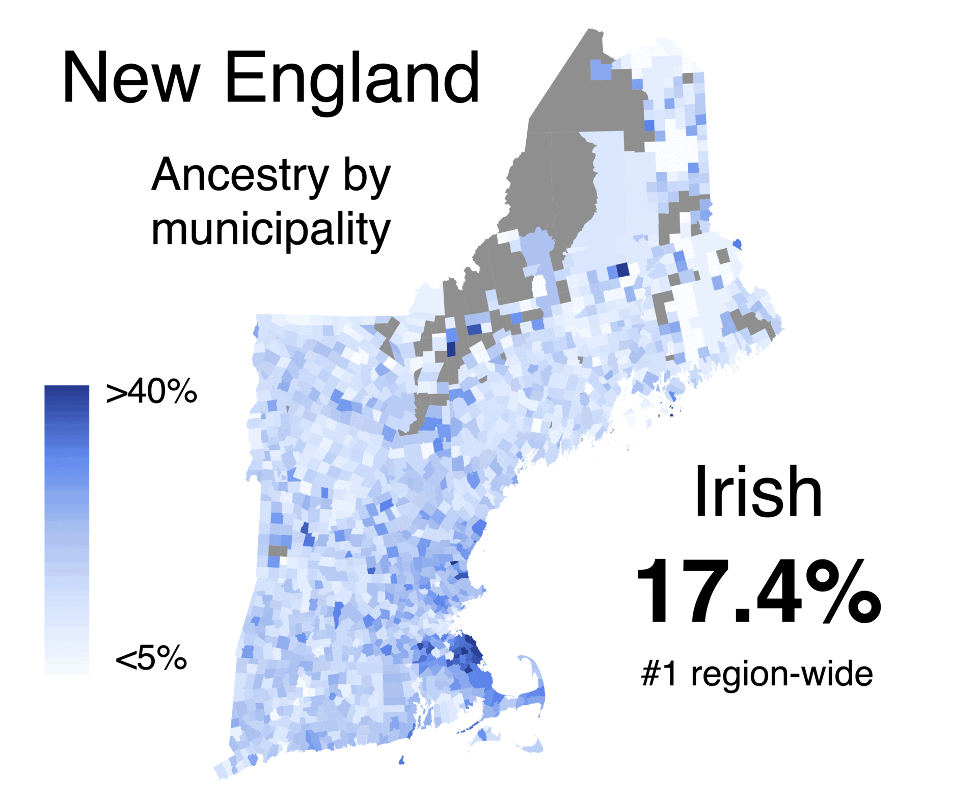 This GIF provides an overview of New England’s demographics. Unlike America as a whole, where German is the most common ancestry, Irish and Italians dominate New England. The Irish are well-represented almost everywhere in the region, but they’re most heavily concentrated along Massachusetts’ South Shore; Italians are prevalent in southern Connecticut.
