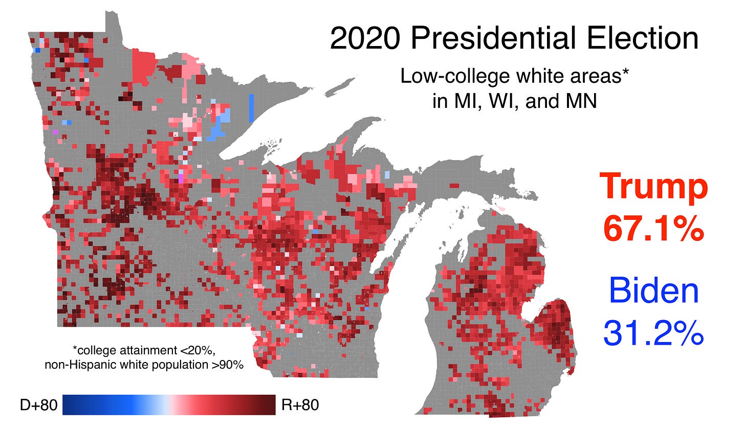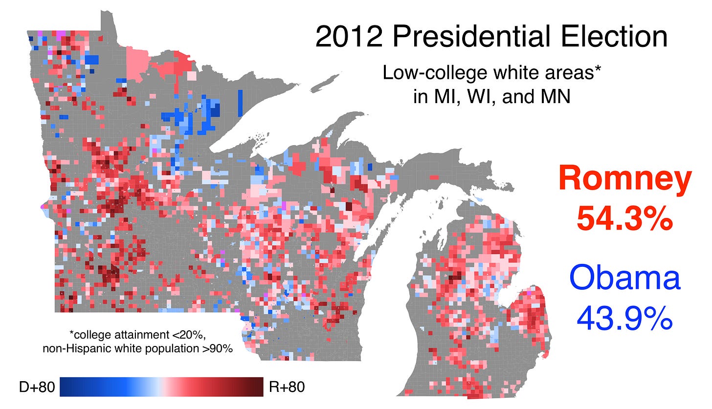 Donald Trump changed the U.S. electoral map in 2016 by producing huge movement toward him among white voters without a college degree. These maps show how places dominated by these voters in three upper Midwestern states that have historically voted for Democrats went from semi-competitive to blowouts for Trump.