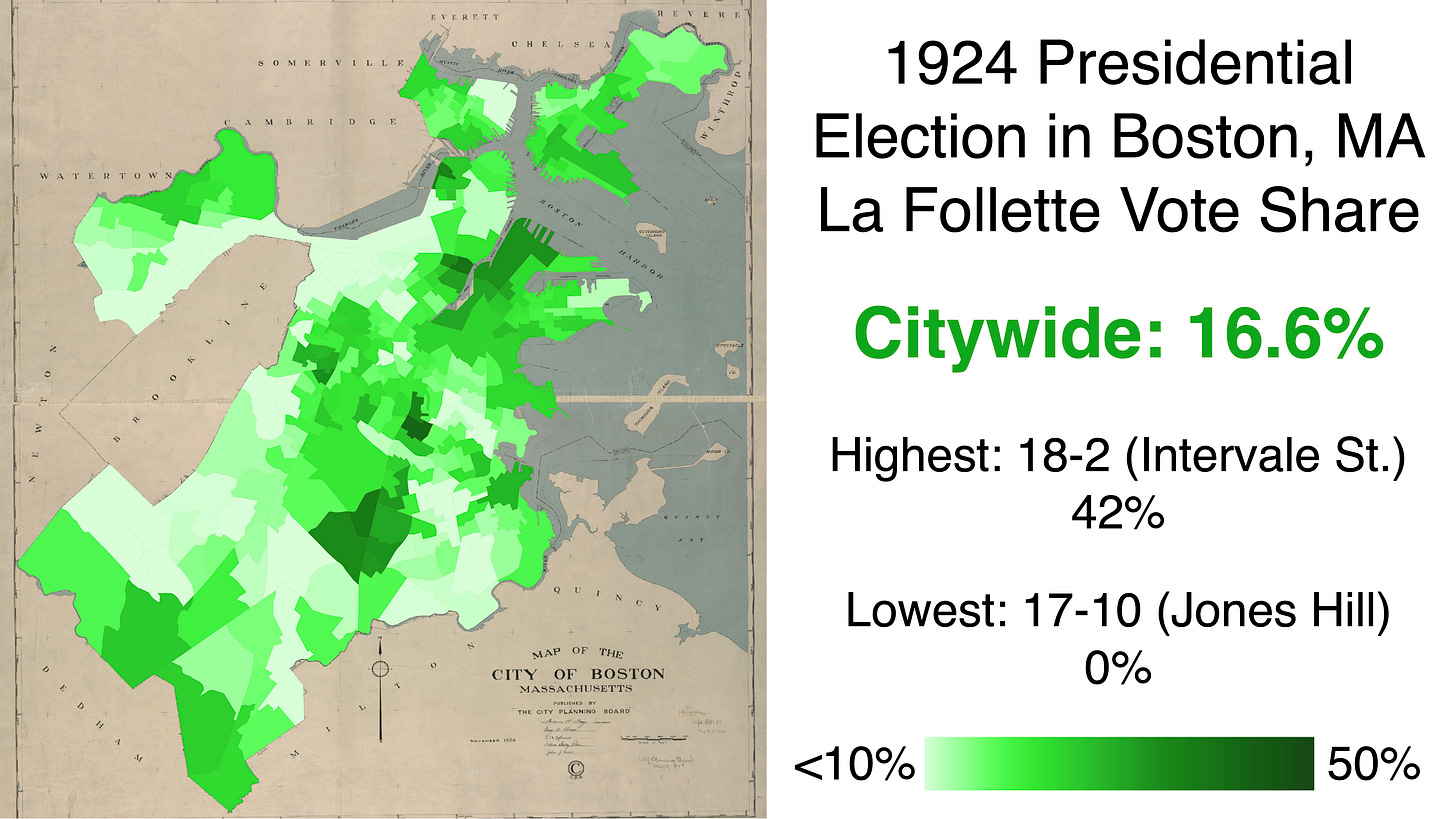 However, the disappointment of Smith's convention loss and the candidacy of Progressive Robert La Follette severely weakened Davis in Boston. La Follette's strongest precincts were in areas with high concentrations of working-class immigrants like Fort Hill and South Boston: