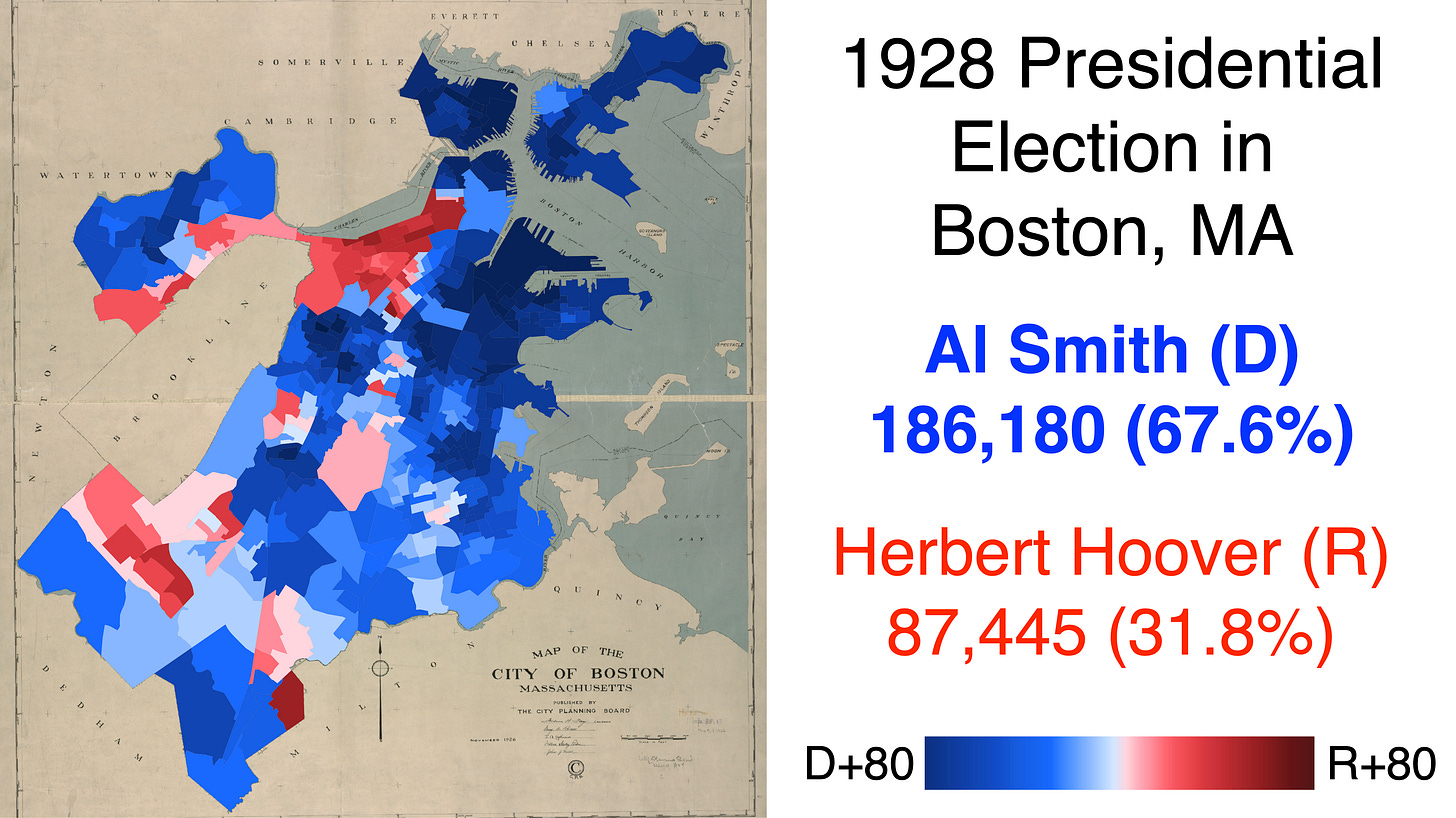 1928 is an inflection point in Boston’s political history. Al Smith won the Democratic nomination, becoming the first-ever Catholic candidate for president, supercharging Irish and Italian enthusiasm and producing an unprecedented Democratic landslide in the Hub even as he was trounced nationwide. Since this election, no Republican has carried the city.