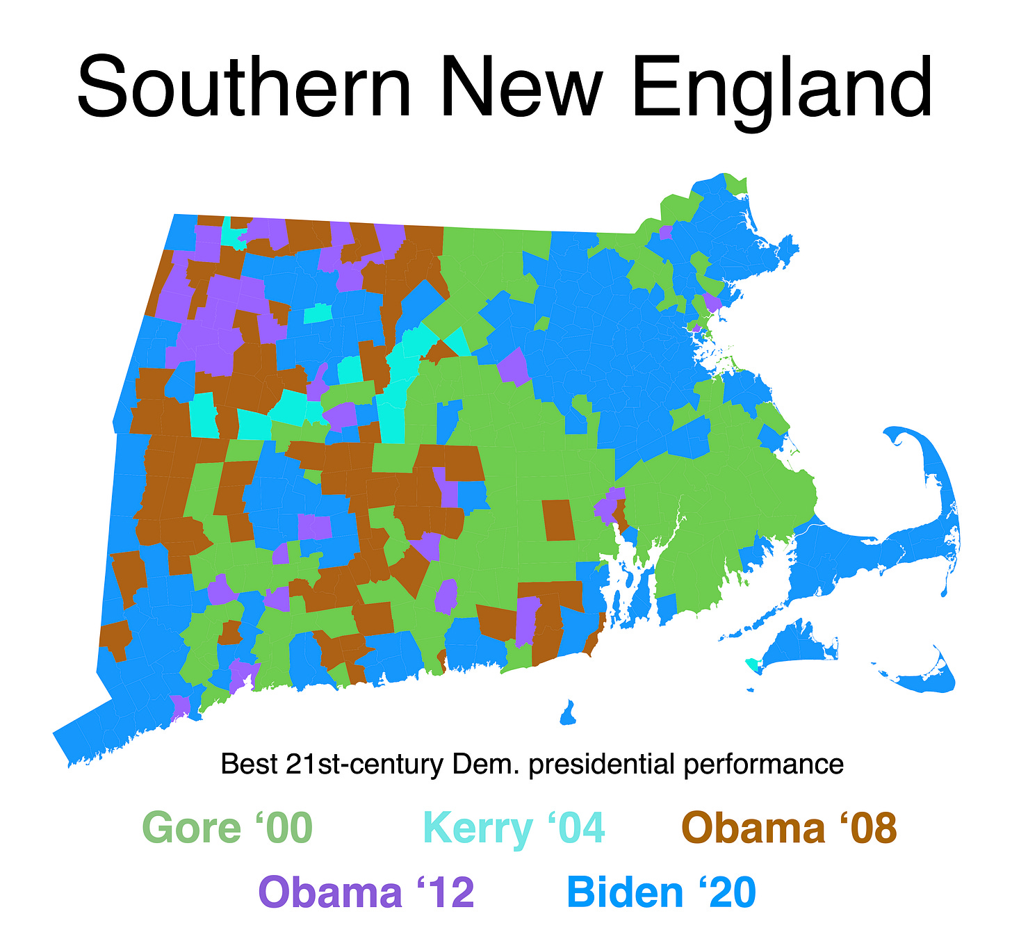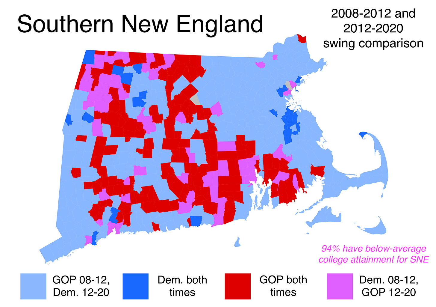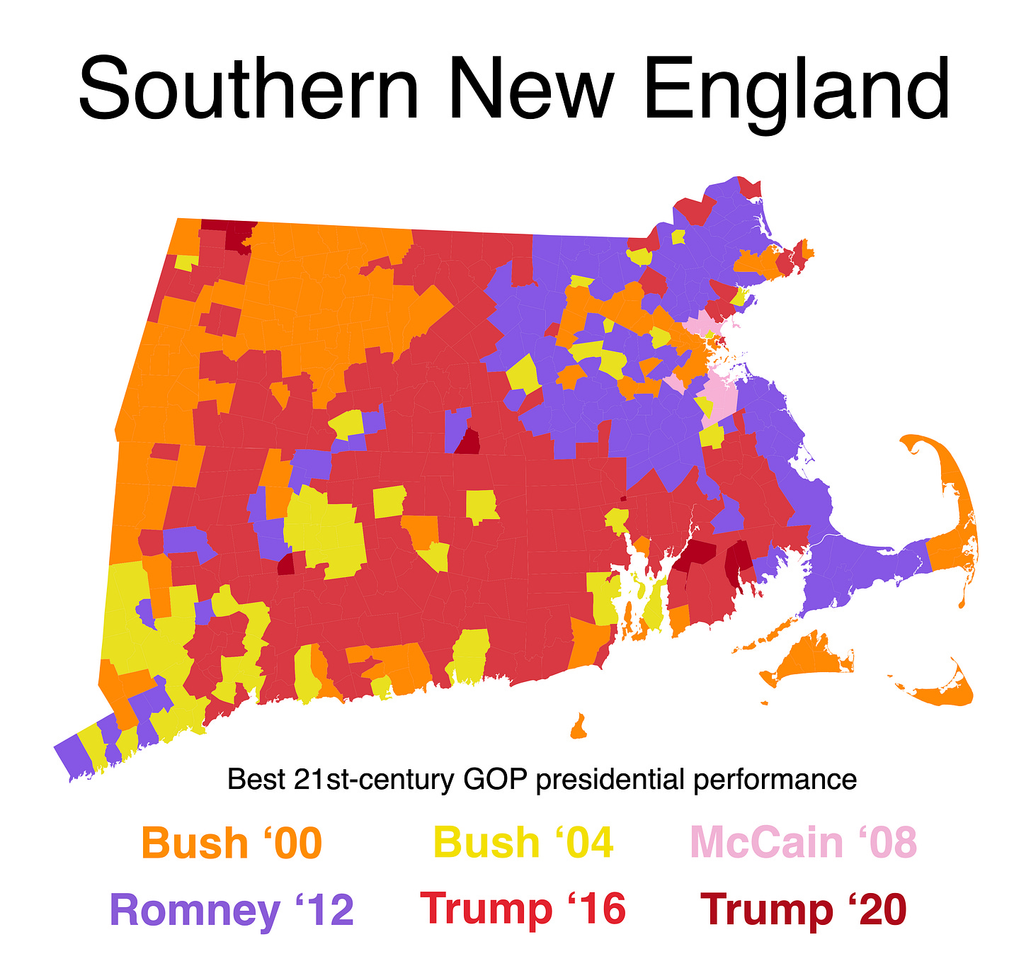Across much of the region, Trump made anomalous inroads in 2016, setting a high-water mark for modern Republicans in most of Connecticut and Rhode Island. Meanwhile, liberal old-money areas (Route 2, Newport, Lower Cape) turned very blue long before Trump. Mitt Romney’s home-state boost in eastern MA is evident as well.