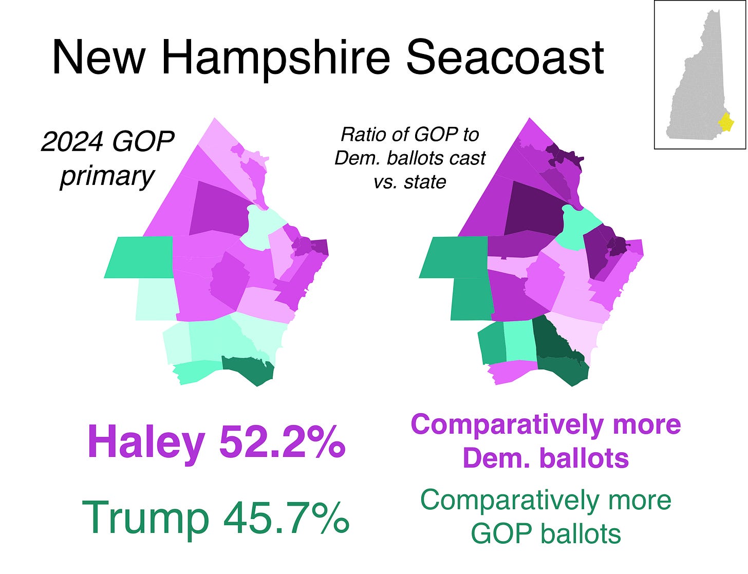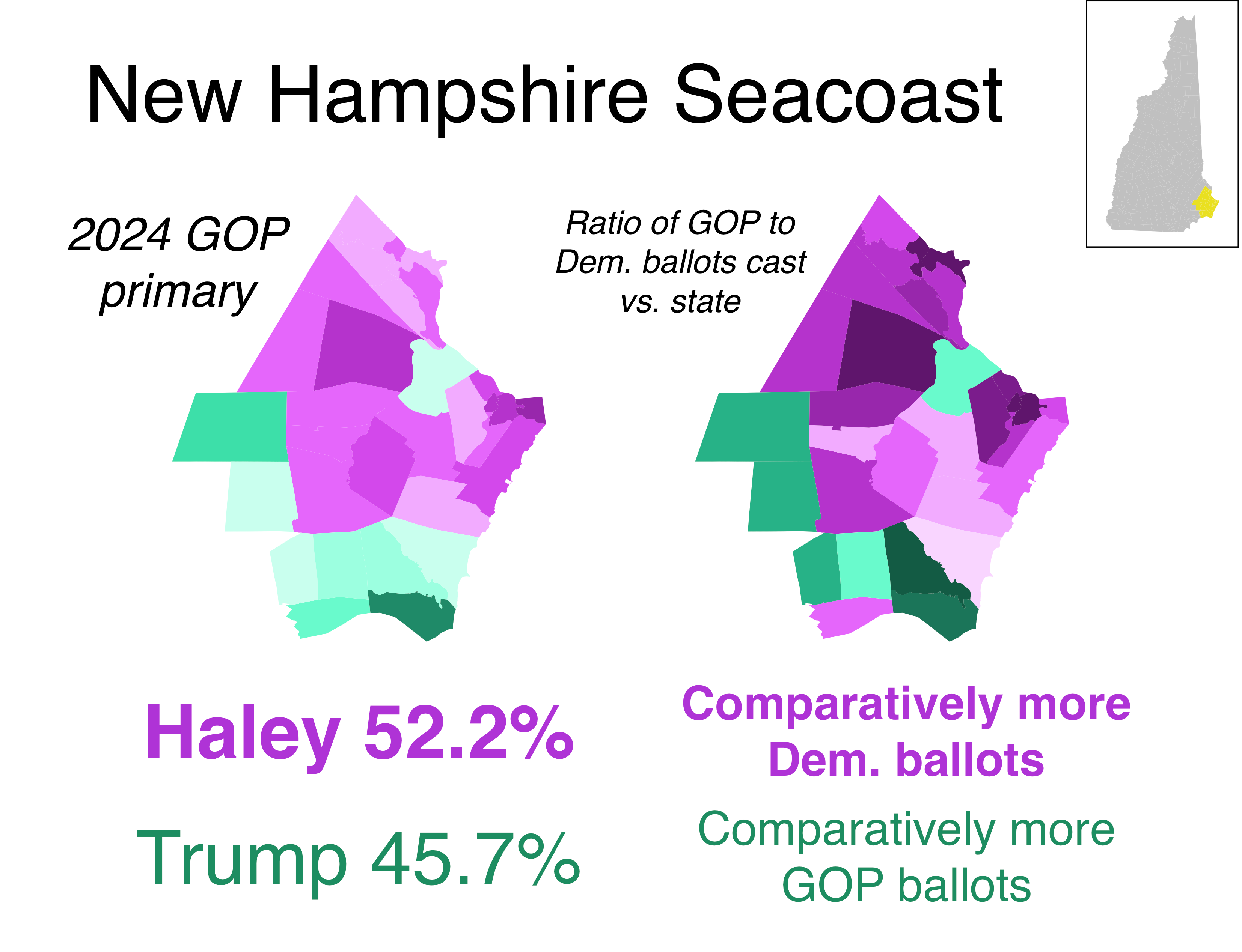Nikki Haley couldn’t pull off the upset against Donald Trump in the 2024 New Hampshire Republican primary. The main reason for her defeat was her failure to energize enough Democrats to pull Republican ballots. The Seacoast region is a prime example: in its most Democratic places, like ultra-blue Portsmouth, GOP ballots barely outnumbered Democratic ones, despite Haley’s campaign heavily courting crossover votes.2