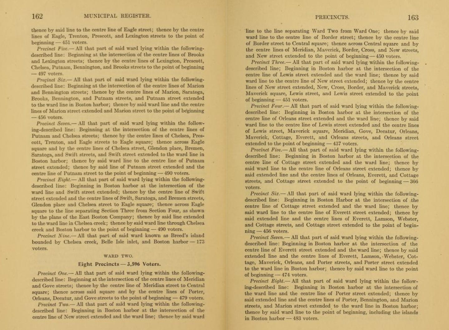 Then, I pulled up the Boston Public Library’s digitized municipal register books. These reference documents contain text descriptions of each precinct — enough information to draw precincts, one by one, tracing every line through mazes of streets, parks, and coastline: