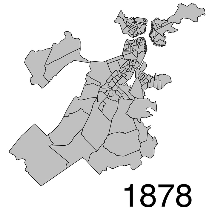 Additionally, because precincts needed to have equal numbers of voters and Boston was rapidly growing, the precinct map changed frequently. Observe the difference between Boston’s first map, inaugurated in 1878, and the precincts in use 47 years later!