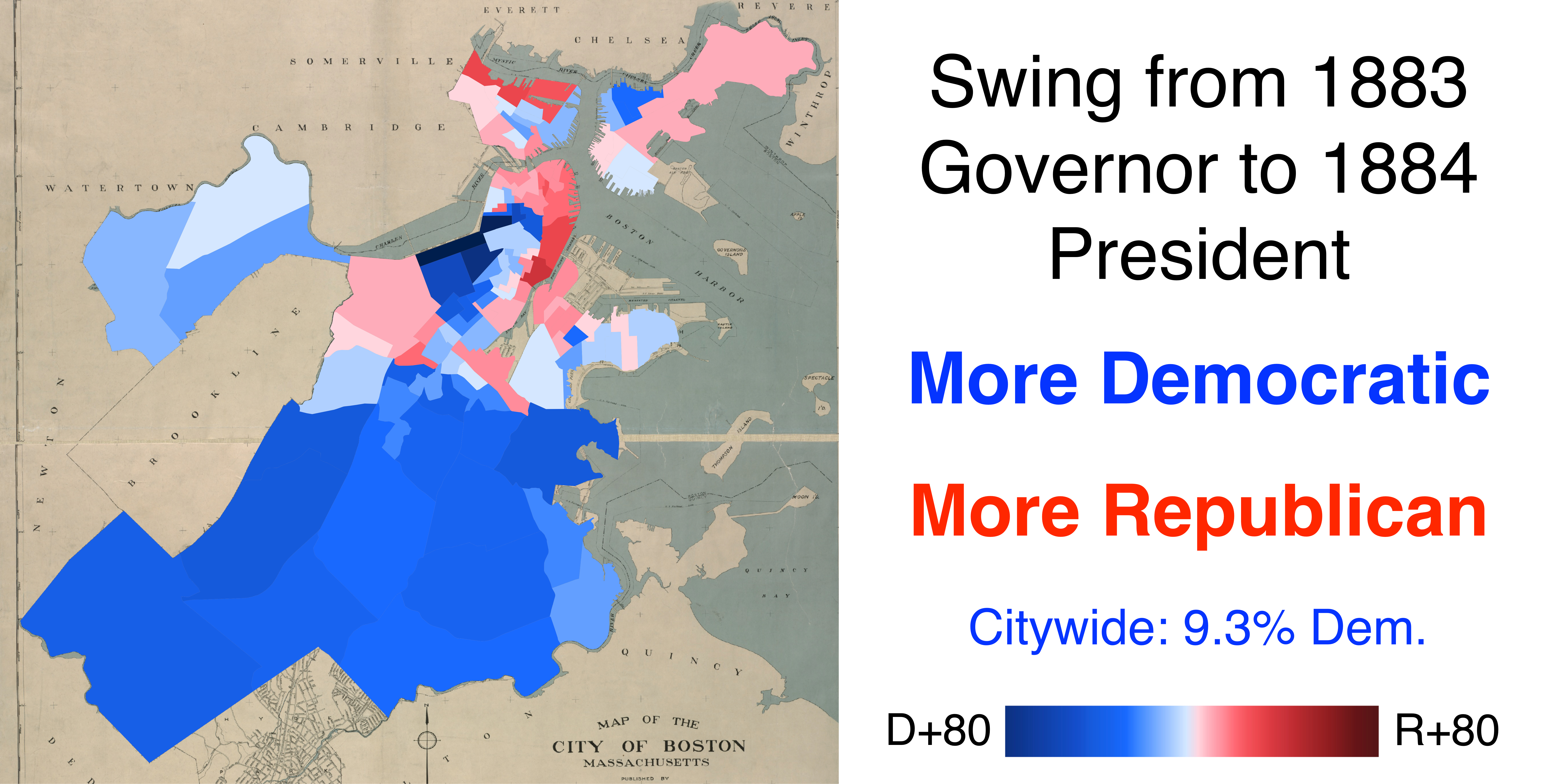 Public interest in the 1883 election was remarkable — turnout exceeded that of the previous and subsequent presidential elections. The proper residents of the Back Bay detested Butler’s dictatorial, abrasive style; he barely cracked 10% of the vote there. But the next year, the Mugwumps propelled Grover Cleveland to a near-draw in this previously unflinchingly Republican neighborhood. One precinct swung an incredible 109 points, from a 95%-5% Butler loss to a 59%-40% Cleveland win!