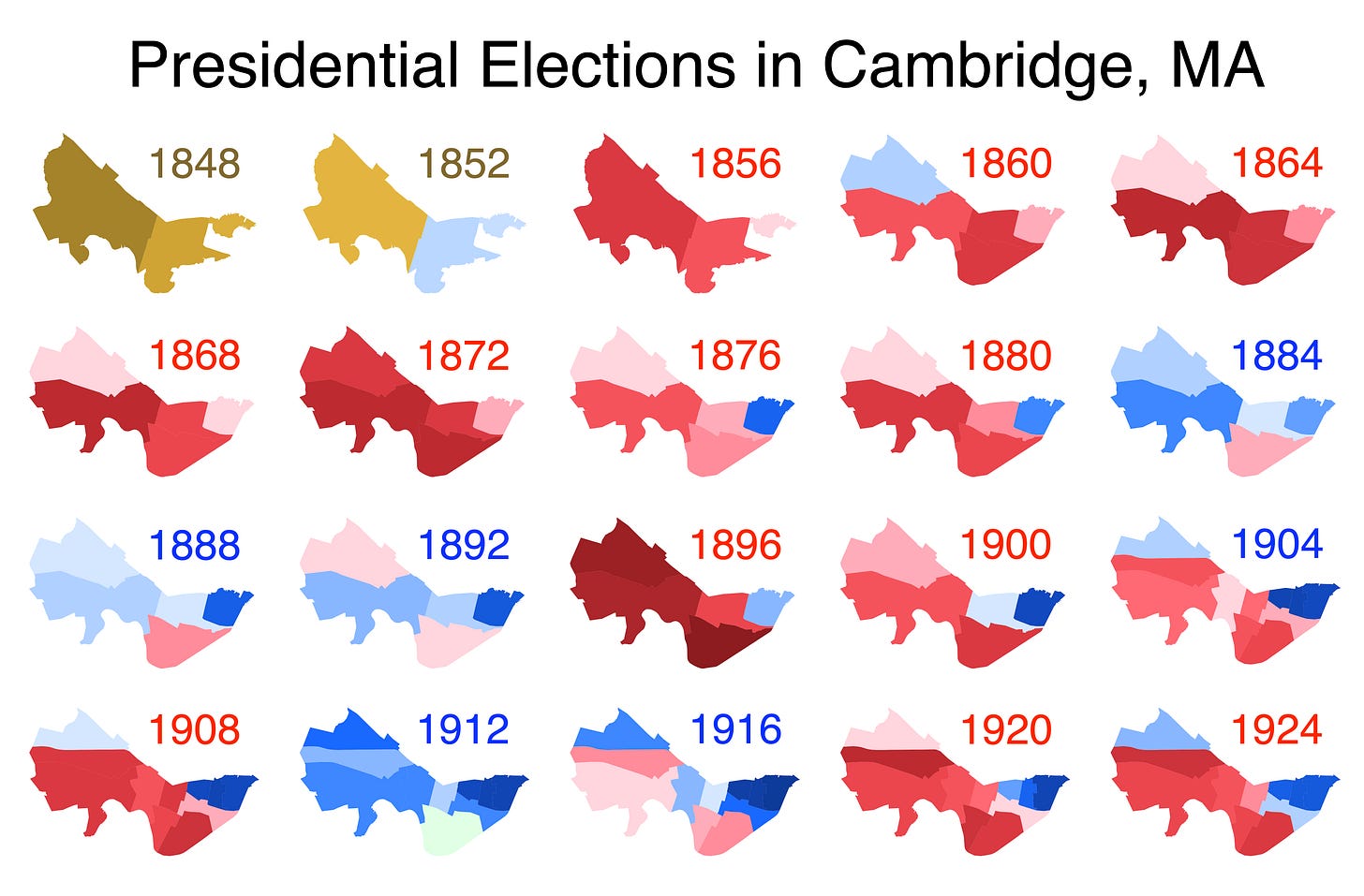 Before Al Smith came along and realigned Northeastern urban politics, Cambridge was an extremely competitive city. As a native, I was shocked to learn this, having only known the version of Cambridge notorious for its lopsided politics. Originally a Republican stronghold, the city’s competitiveness increased along with its Irish population, which concentrated in the newly developed industrial neighborhood of East Cambridge. Meanwhile, Old Cambridge (modern-day Harvard Square) remained staunchly Republican even past 1924, thanks to its strong contingent of worldly professorial types who didn’t see themselves in the urban-immigrant heavy Democratic Party of the time.