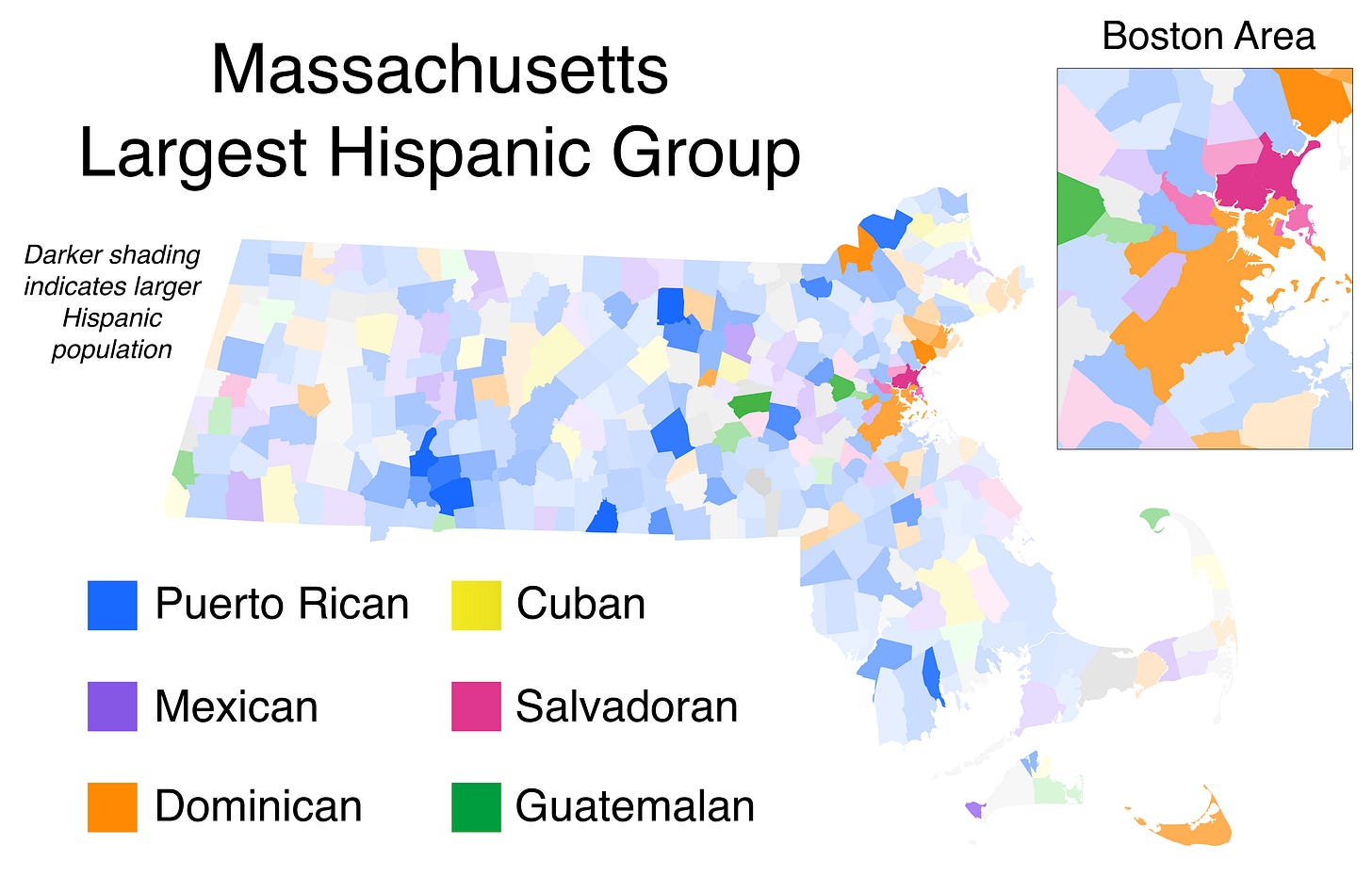 I enjoyed this map because it captures two variables at once: each place’s most prominent Hispanic group as well as how Hispanic the place is. Unlike most of the U.S., the majority of Hispanics in Massachusetts are either Dominican or Puerto Rican, and they’re concentrated in post-industrial cities like Lawrence and Holyoke.