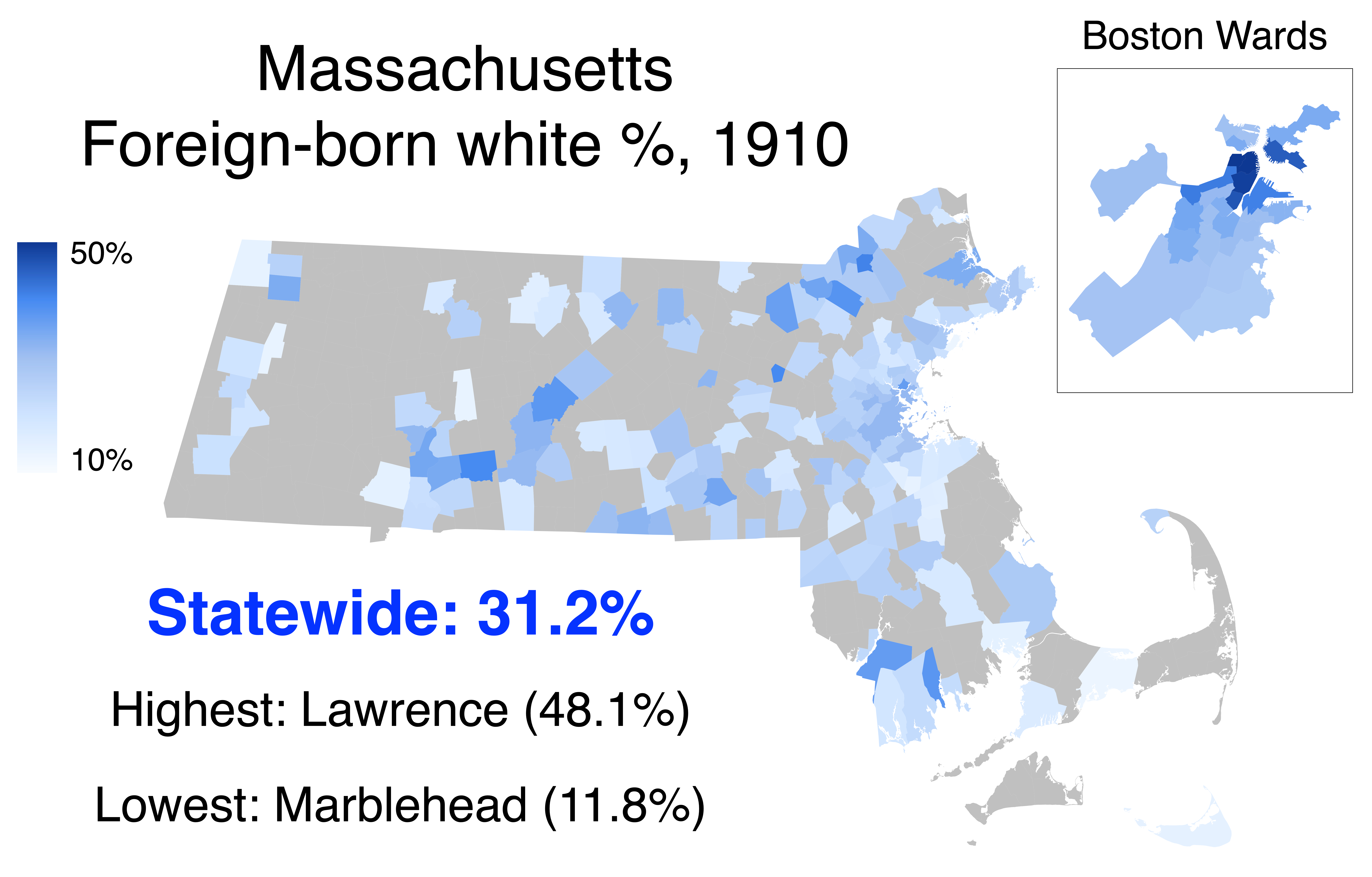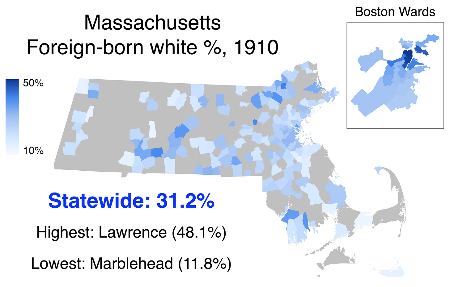 In 1910, nearly one-third of Massachusetts residents were foreign-born whites. They were nearly a majority in industrial centers like Lawrence and New Bedford; the yachting hub of Marblehead sat at the other end of the spectrum.