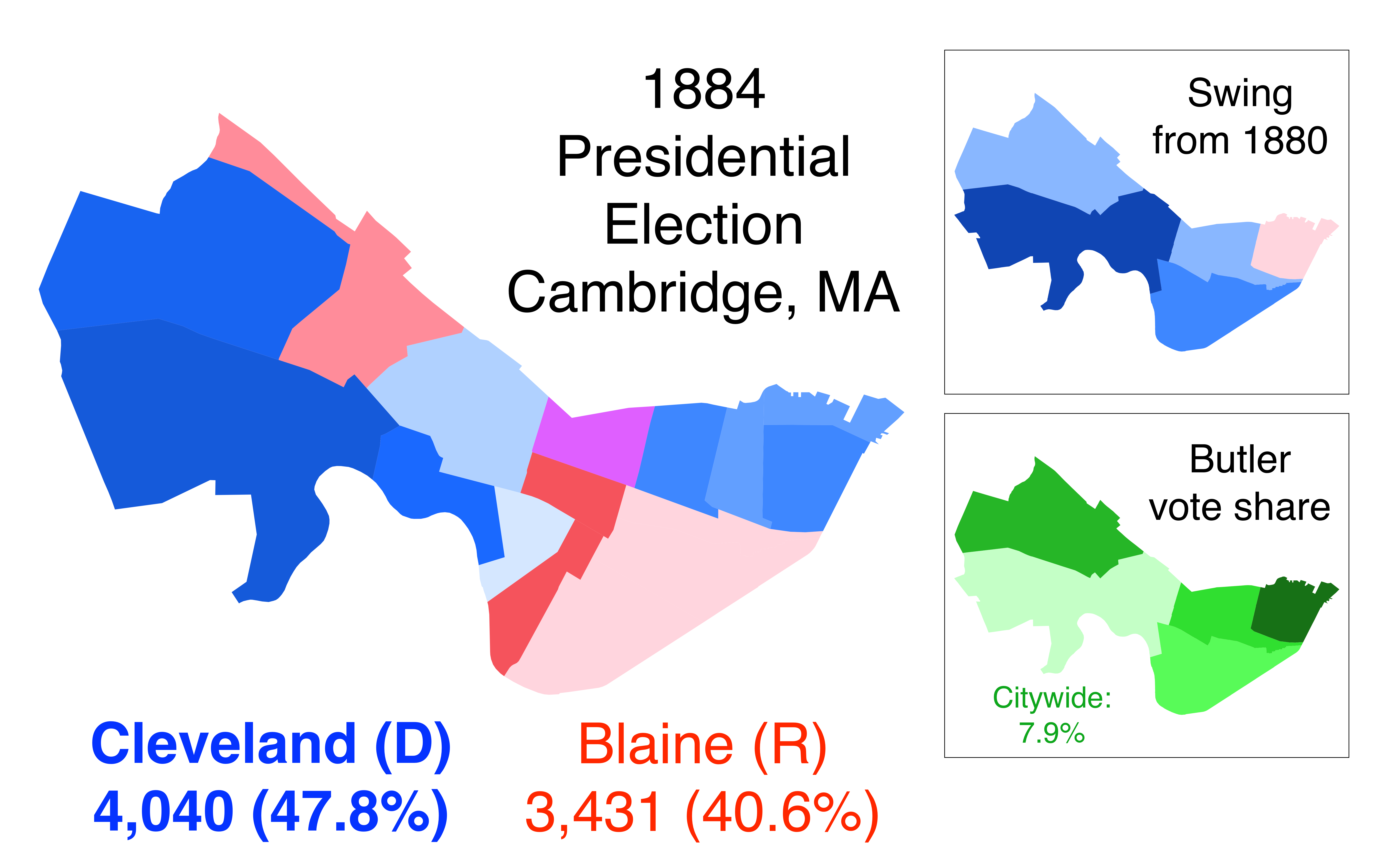 Thanks to the combined effects of Butler and the Mugwumps, this was the only time between 1848 and 1924 that a ward containing Old Cambridge voted more Democratic than a ward containing East Cambridge.