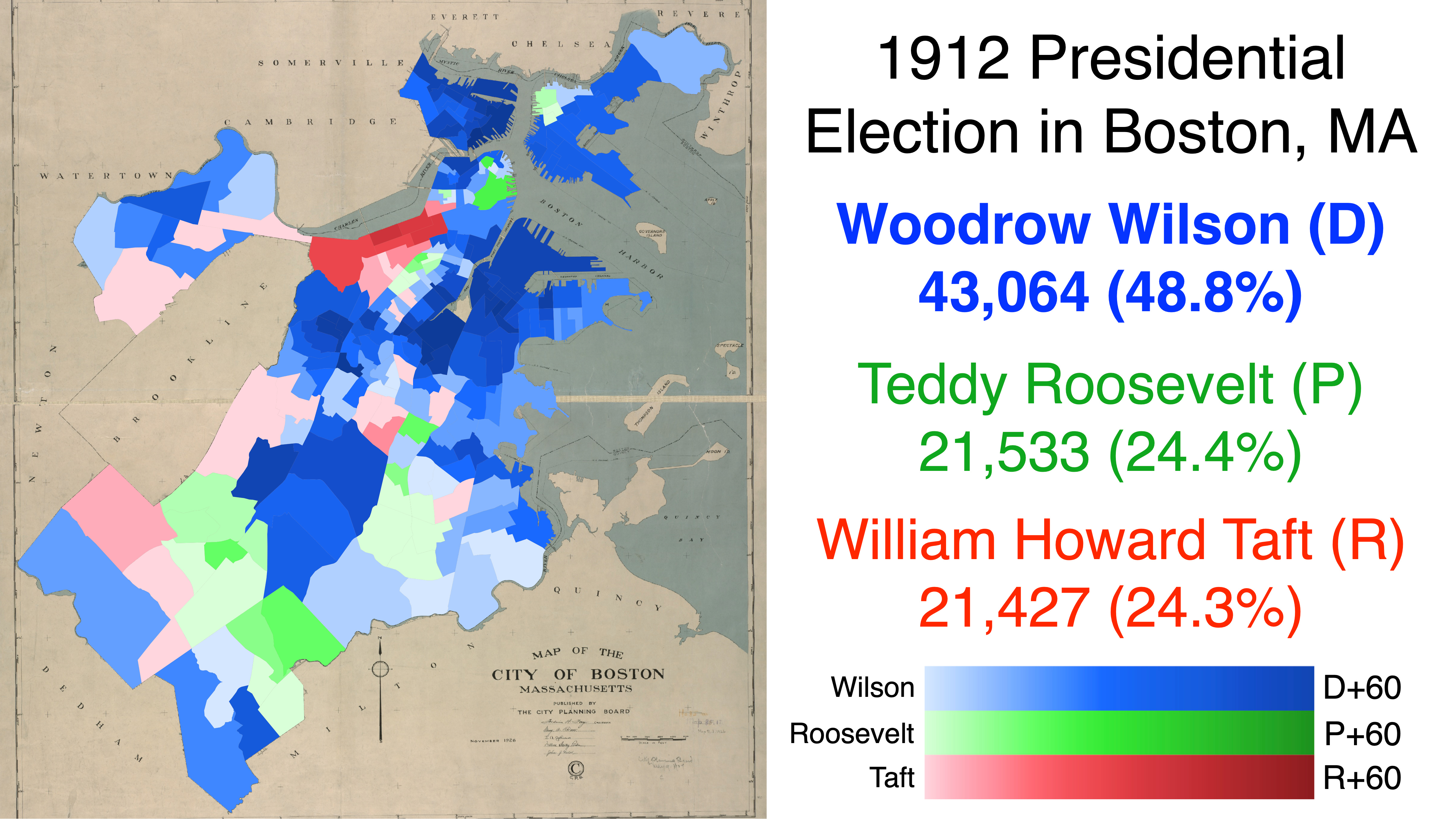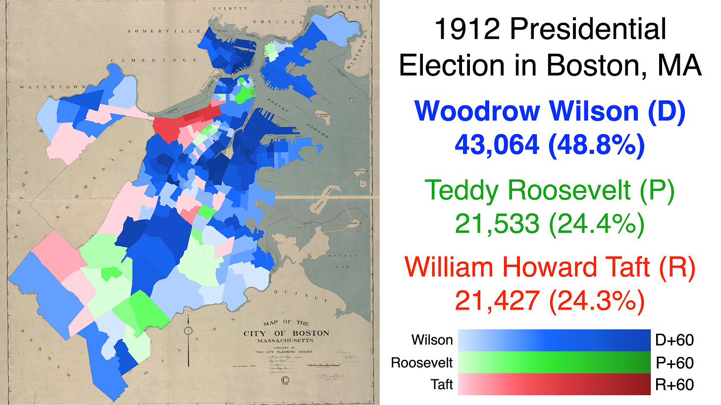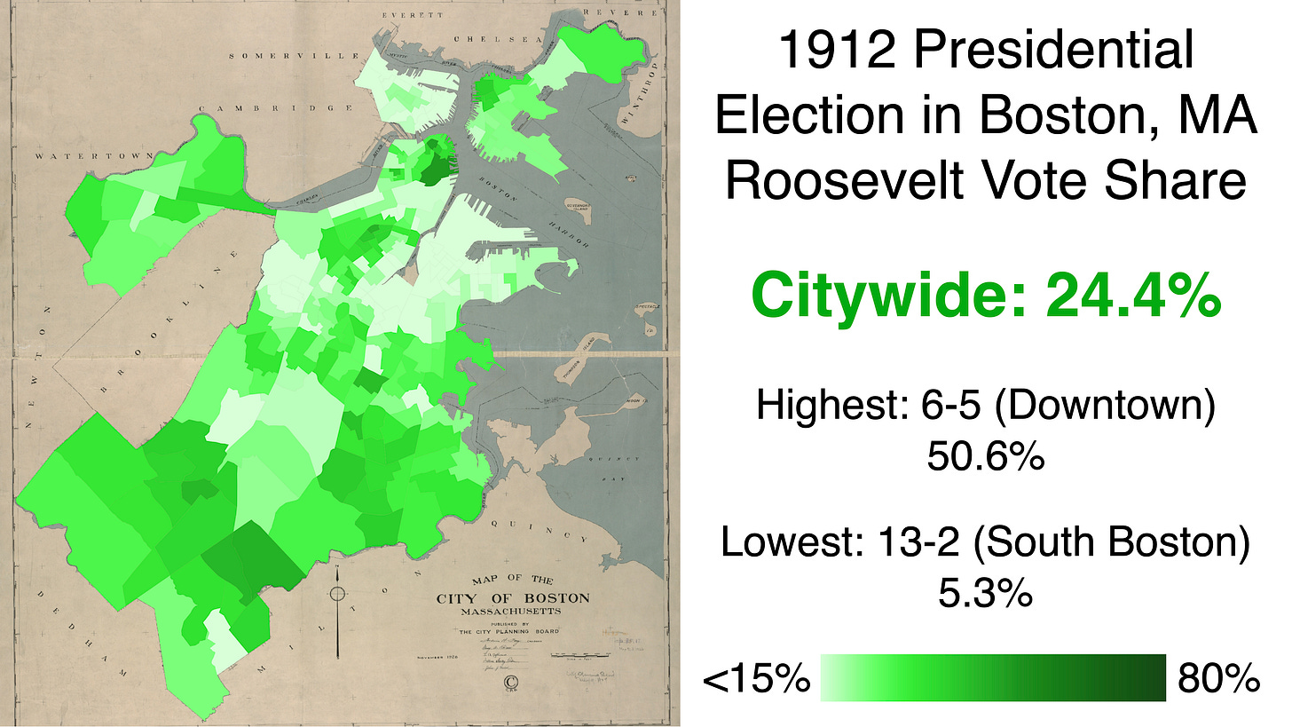 Now, back to 1912. As was the case for any Democrat of his era, Woodrow Wilson's strongest precincts were located in the heavily Irish sections of Charlestown and South Boston. President Taft did best with wealthy Yankee Republicans, few of whom defected to Roosevelt; in fact, Wilson came second in the Back Bay. Taft’s worst precinct was in the West End, a working-class area characterized by crowded tenements. Teddy Roosevelt failed to make inroads in loyally Democratic Irish areas, but fared well in the predominantly Italian North End and took substantial shares in normally Republican streetcar-suburban neighborhoods like West Roxbury and Dorchester.