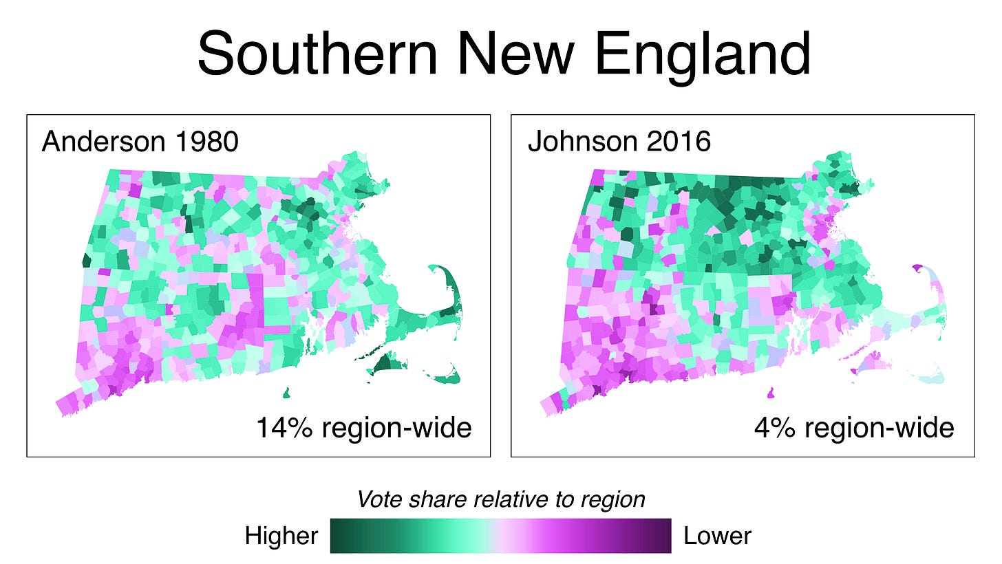 In his independent 1980 presidential campaign, socially liberal Republican John Anderson excelled in Southern New England’s intellectual bastions. His best town in the region was Lincoln (which also produced Trump’s worst showing in Mass. in the 2024 GOP primary). But with Anderson’s strongholds firmly in Democratic hands now, third-party voting patterns have changed. Gary Johnson, the main option for 2016 voters who despised both Hillary Clinton and Trump, tanked in cities, doing best in low-college white areas or super ancestrally Republican towns like Darien, CT and Dover, MA.