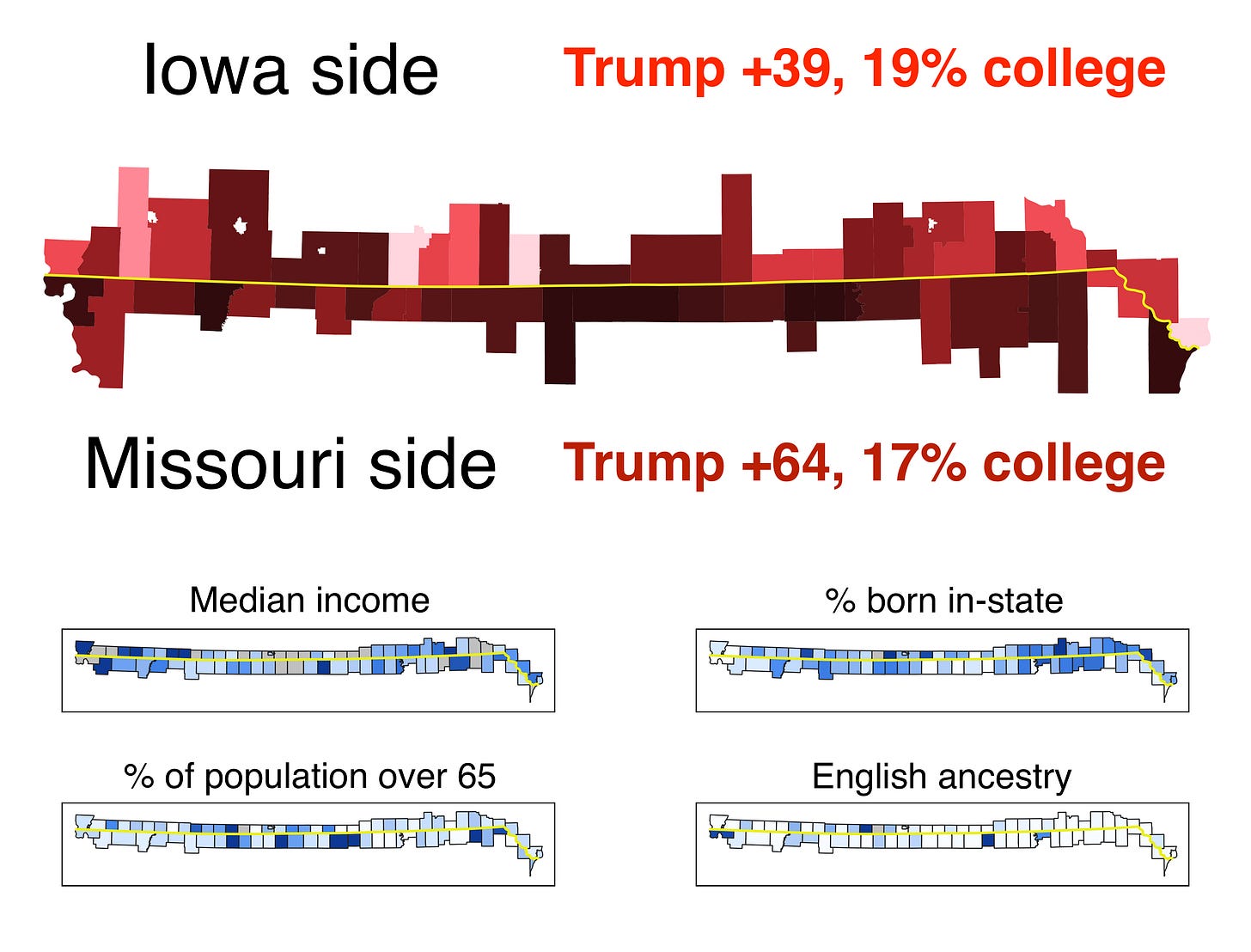 This map set illustrates the curious divergence in voting patterns along the border shared by Iowa and Missouri. While these areas are very similar in terms of age, income, ancestry, and education level, the Missouri side of the border consistently votes more strongly Republican. A helpful reply alerted me to the likely culprit: the Iowa side is mostly Methodist, in contrast to the Missouri side’s Southern Baptism.