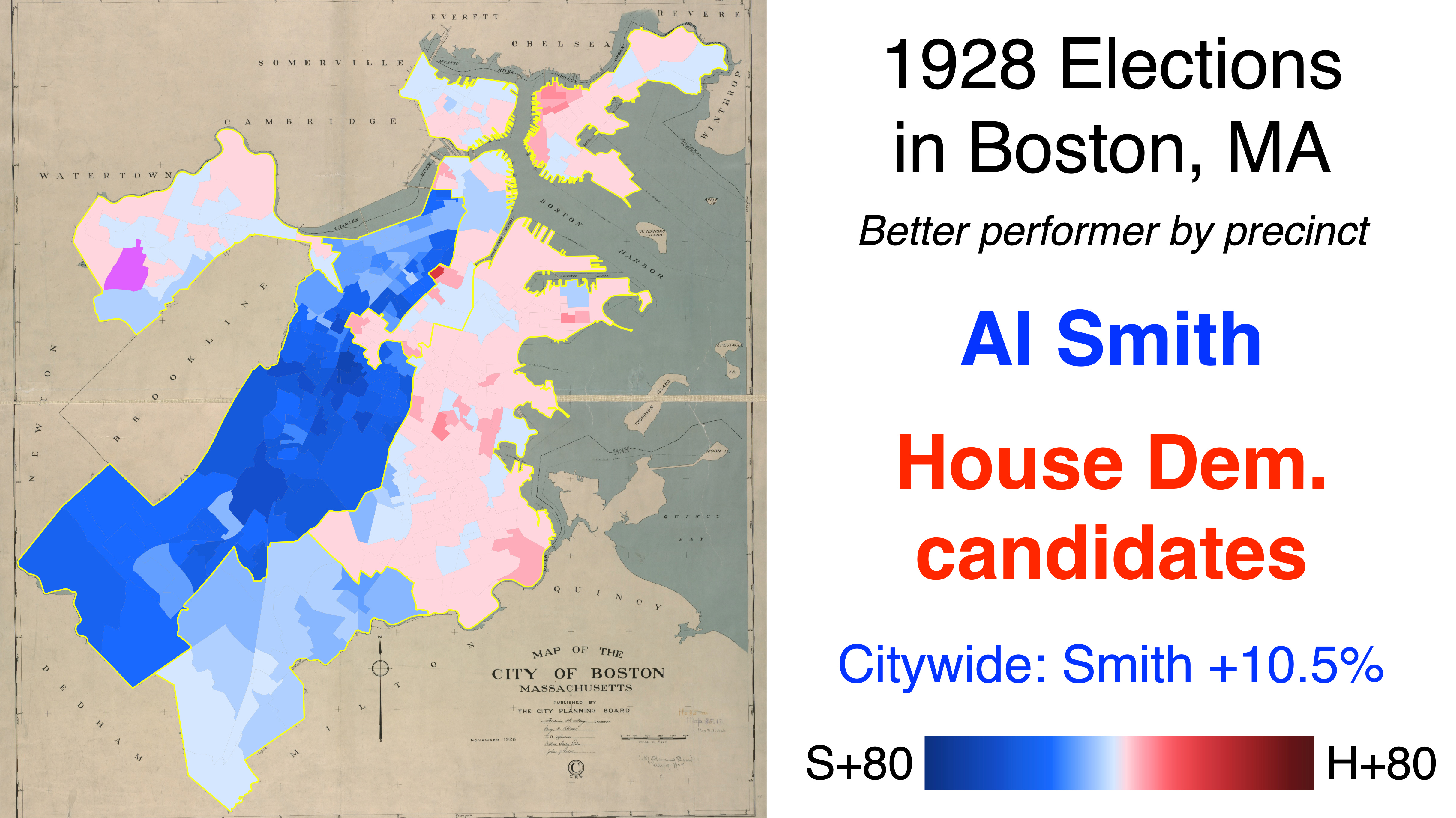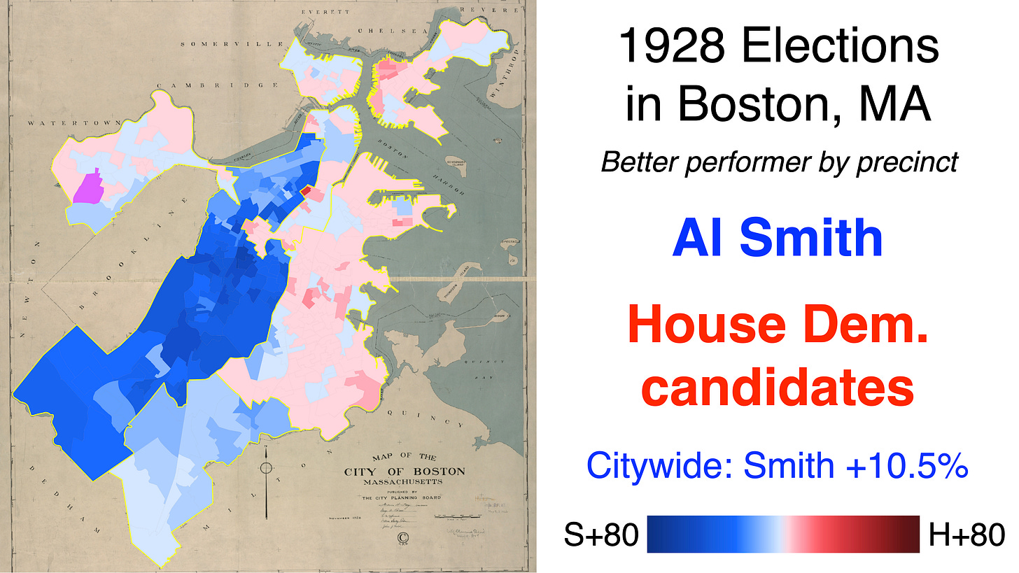 Although Curley was popular among the Irish, he still ran behind Democratic House candidates in Irish areas, as was typical. However, Smith bucked this trend, despite House candidates doing better in 1928 than 1924!