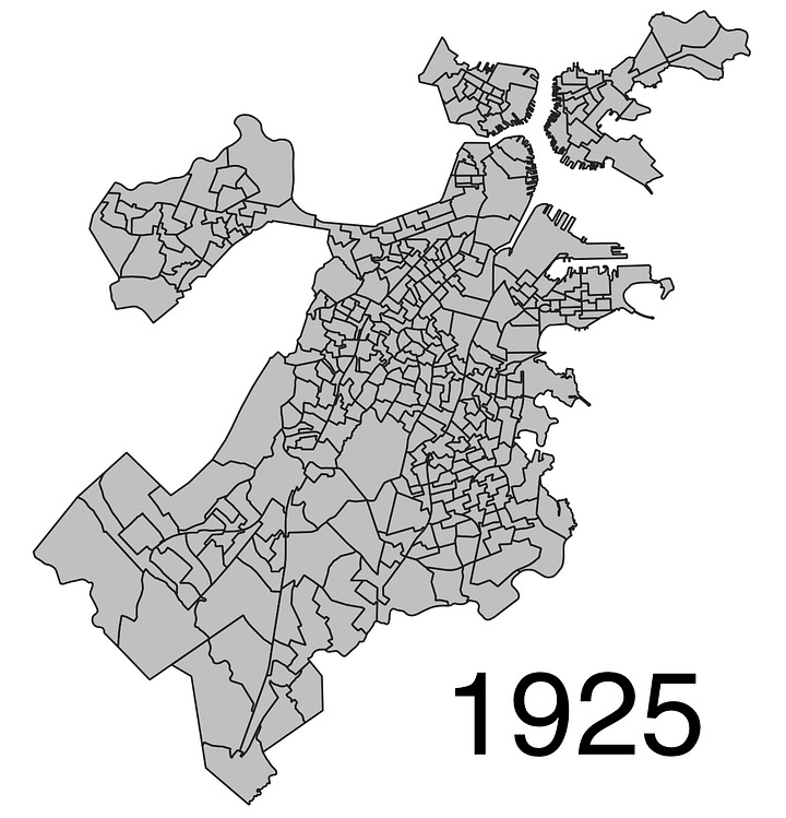 To make a map, you need two things: the election data and a shapefile (which has boundary lines for the area you’re mapping). If you’re looking at a modern election, finding professionally-made shapefiles is a trivially easy task. Understandably, though, no one had taken the time to digitize Boston’s precincts from over 100 years ago. So I did it myself!